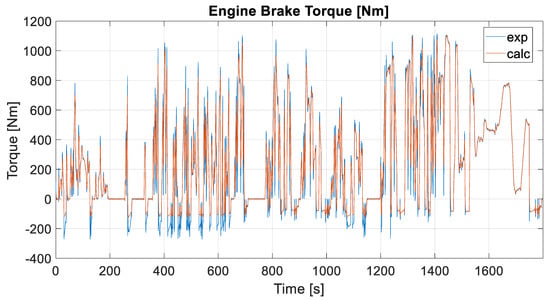 Engine brake torque comparison with experimental data during a WHTC driving cycle.