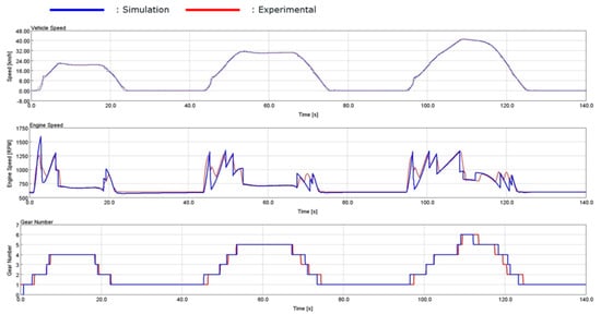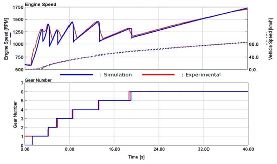 The model behavior has been validated using two different measurements: the first was a full acceleration test, which helped calibrate not only the upshift behavior, but also the inertias of the transmission and a start-stop cycle. As can be seen in Figure 12 and Figure 13, the model has a very good match with the experimental data, closely replicating the behavior of the vehicle’s transmission.