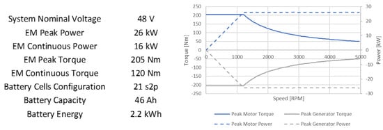 For this study, the choice was made to adopt a 48 V P1 hybrid architecture shown in Figure 2, which constitutes an optimum for this kind of vehicle in terms of the balance between fuel consumption reduction potential and capital costs, thus minimizing the total cost of ownership.