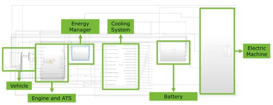 The first task was to use the co-simulation platform to create a reference baseline case, to which all the other hybrid configuration results could be compared. This configuration, presented in Figure 14, is a digital twin of the non-hybrid HD urban bus, and therefore it includes the following models only: