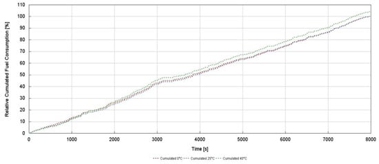 Normalized cumulative fuel consumption comparison with experimental data during the WHTC cycle.