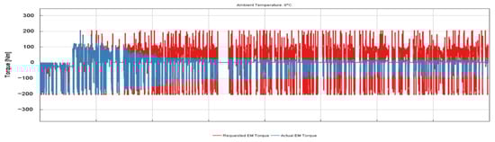 In this paragraph the validation performed under transient conditions is presented. The same 1D engine model is run, varying the engine speed and brake torque required, to simulate the engine behavior during a WHTC driving cycle. The engine speed is imposed, while the engine torque requested to the engine corresponds to the measured torque during the driving cycle. The 1D model exploits an internal PID controller to achieve the requested engine torque, as time proceeds. The resulting engine speed profile is reported in Appendix B, Figure A8. Figure 10 shows the torque profile comparison: the 1D model responds correctly to the changes of torque requested during the WHTC cycle. A comparison of cumulative fuel consumption along the transient is presented in Figure A9, and the results are satisfactory, showing a final error below 5%. This allows for the use of the 1D model in the complete vehicle simulation platform.