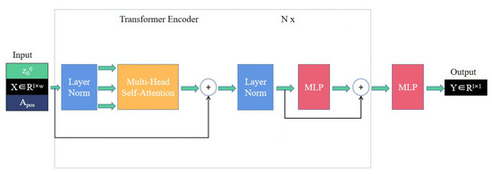 The proposed model is shown in Figure 2. The input of the model is the information of the PV sensor, where l is the length of time representing the sequence, and w is the number of PV sensors. The output of the model is the PV prediction sequence of the target PV sensor. We add a learnable sequence in front of the input for prediction. To fuse the sequence with the position embedding , we add a trainable linear projection A to map the input . The procedure of adding position embedding can be represented as follows:
