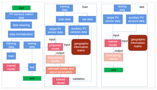 The flow chart of the prediction method is shown in Figure 3. Firstly, we used PV sensors for data acquisition, and then cleaned and normalized the data. Data cleaning includes deleting abnormal data and using the interpolation method to fill the values. We used the max–min normalization method. During both the training and testing processes, our model took as input the information from the target sensor, the auxiliary sensor, and the geographic information matrix. For the geographic information matrix description, please see Section 2.3.