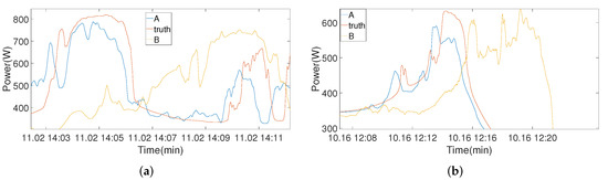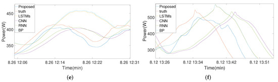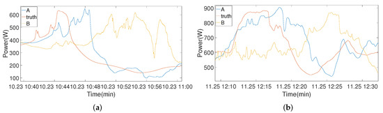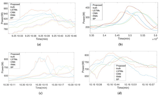 In order to ensure the stability and authenticity of the experimental results, we conducted several experiments on the two datasets. The experimental results are shown in Table 1 and Table 2. As can be seen from the table, we list the mean and variance of the errors for each model on the two datasets. When the prediction time was 60 s, the error of our model was not much different from the comparison model. This is because the prediction time was short, the model increased the weight of the target sensor information and paid less attention to the auxiliary sensor information. However, as the prediction time increased, our model had much lower errors than the comparison model. In terms of stability, we used the standard deviation. It can be seen that our model has high stability. The effect of our model greatly improved after adding auxiliary information from surrounding PV sensors; in particular, as the delay time increased, our model exhibited a slower decline in prediction accuracy compared to the other models in the comparison. As the prediction times increased to 300 s and 600 s, there was a significant gap between the MSE and MAPE values in each model. The reason for this huge gap is that there was a gap among the models in their ability to assess the decline time of the PV forecast curve. As shown in Figure 4, one can see how each model predicts the curve at 300 s. When the real PV curve fell, our model reacted more quickly to sense the drop compared to other models. Other models require a delay of about 200–250 s to sense a drop. When the prediction time reached 600 s, as seen in Figure 5, the time gap between the models in sensing the decline of the real PV curve was greater. However, our model incorporates information from PV auxiliary sensors, reducing the time it takes for the model to sense the decline in the PV curve, and even anticipate it in advance. The x coordinates of all pictures represent Beijing time (UTC + 8:00), and the y coordinates represent power generation.