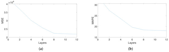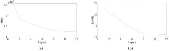 (a) The MSE and (b) the MAPE of our model on different encoder layers (prediction time 300 s; both MSE and MAPE are calculated using denormalized values).