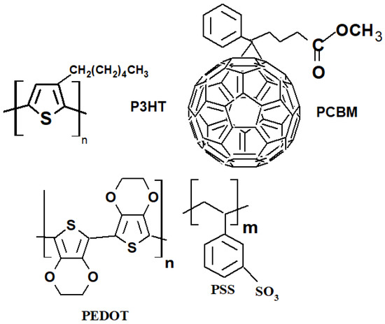 Bulk heterojunction organic solar cells with a standard architecture (glass/ITO/hole transporting layer (HTL)/active layer (AL)/electron transporting layer (ETL) or metallic electrode) were prepared using wet chemistry and physical methods. On top of the glass substrate with six ITO (indium tin oxide) pixels with an active area of approximately 4.5 mm2, PEDOT:PSS (poly (3,4-ethylenedioxythiophene):polystyrene sulfonate) was spread using the spin-coating method. With chlorobenzene solution, P3HT (poly (3-hexylthiophene-2,5-diyl)) and PCBM ([6,6]-phenyl C61 butyric acid methyl ester) in a weight ratio of 1:1 were spread on top of the HTL using spin-coating equipment in an inert atmosphere. For the half-organic solar cells, the preparation of samples was complete after the preparation of the AL. To produce complete BHJ OSC devices on top of the active layer, aluminium electrodes were evaporated using vacuum equipment. The chemical structure of the organic materials used to prepare BHJ organic half-cells and cells is presented in Figure 1. A detailed description of third-generation solar cell preparation with absorbers and active layers based on (P3HT:PCBM) (1:1) blends with or without iodine (I2) doping (0, 5, 10% mol) is presented in the article [37].