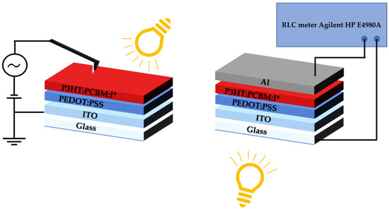 Photoactive impedance spectroscopy (p-IS) tests of third-generation solar cells were carried out in a Faraday cage connected to vacuum pumps. p-IS measurements were conducted with the precise RLC meter Agilent HP E4980A in the frequency range from 20 Hz to 1 MHz using small signal voltage excitation of 20 mVrms. To identify the phenomenon of the photogeneration of charges, experiments in the dark and under illumination were conducted. During the p-IS experiments, photovoltaic devices were placed into the sample holder, which allowed us to conduct experiments on all six pixels in a single measurement sequence. Schematic diagrams of the organic solar cell and half-cell are presented on Figure 2.