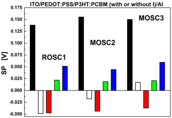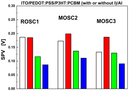 The p-KPFM measurements also allowed us to estimate the surface photovoltage (SPV) [39] parameter at the micro- and nanoscale as a difference between the surface potential in the dark and under illumination (see Figure 4). It was also assumed that the response of the studied samples to white light was the same as or more intense than that to red, green or blue light. However, for the samples doped with iodine versus the reference sample (ROSC1), a decrease in the difference between SP in the dark and under the illumination of white light was observed.