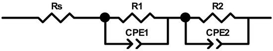 The commonly used equivalent circuit for organic BHJ OS cells is shown in Figure 6 [51,54,56]. Its components are directly related to the measured impedance spectrum shown in the complex plane. Such a spectrum usually forms two semicircles, one recorded at lower frequencies and another at higher frequencies. Each semicircle is modelled with each parallel Rm-CPEm circuit. It is possible to evaluate the time constant of such a circuit: