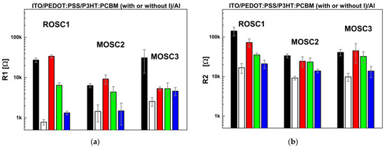 By analysing the standard deviation of the arithmetic mean and the estimated average values presented in Figure 7, it is possible to notice that the incorporation of dopant in the form of iodine into the active layer of the BHJ OSC (MOSC2, MOSC3) caused a decrease in the resistances and compared to the parameters of the reference sample (ROSC1) measured under dark conditions. This kind of electrical resistance behaviour, which consequently led to improved charge transport, was related to the influence of iodine on the structure of the active layer of the BHJ OSC devices, which resulted in improvements in the phase separation between P3HT and PCBM [43] and the P3HT crystallinity [37,57].