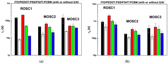 Figure 8 shows the results of the estimation of relaxation times related to the electron diffusion (τ1) and recombination of electron-hole pairs (τ2) for doped and non-doped BHJ OSCs with iodine. In the case of p-IS measurements conducted in the dark and under green light, the relaxation times of charges related to τ1 and τ2 were maintained in the same way as the resistance described before R1 and R2, respectively (see Figure 7 and Figure 8 for comparison). Interesting phenomena occurred in the case of the illumination of BHJ OSC devices with white and blue light. An increase in electron diffusion times was observed for samples with iodine doping (MOSC2, MOSC3) compared to those of the reference sample (ROSC1). On the other hand, from p-IS experiments conducted under the illumination of red light, a decrease in τ1 parameters was observed for MOSC2 and MOSC3 devices compared to those of ROSC1 (see Figure 8).