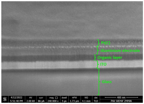 To prepare the cross-sections, the samples were placed in the vacuum chamber of an SEM. All procedures were started after a vacuum of 4.9·10−7 mbar was attained to minimize sample contamination. The fabrication of the cross-section consisted of three steps. First, an approx. 100-nm thick strip was deposited using the FEBID process (electron beam: 10 kV, 1.4 nA; dwell time: 1 µs; MeCpPtMe3 precursor). This step was performed to protect the aluminium electrode (the top layer of the cell) from the destructive effect of the ion beam, which could cause its milling and consequent decrease in its measured thickness. Then, a gallium ion beam with a current of 5 nA and an accelerating voltage of 30 kV was applied to mill through the surface of the sample. In the third step, the milling process was repeated with a decreased beam current (80 pA) to obtain a smoother face of the cross-section. Cross-sections of ROSC1 (0% iodine in the active layer), MOSC2 (5% mol iodine in the active layer), and MOSC3 (10% mol iodine in the active layer) samples were studied using the dual beam scanning electron microscope (SEM) system FEI NanoLab 600i with a focused ion beam (FIB) column to estimate the thickness of each layer of third-generation organic solar cells.