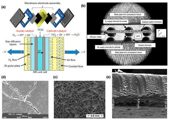 (a) PEMFCs composition. (b) Sectional view of the cell. (c) SEM of a gas diffusion layer. (d) SEM of microporous layer. (e) SEM of catalyst layer and electrolyser, with permission to reproduce from [4] (License number: 5533720610377).