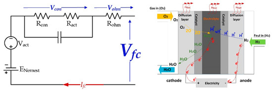Figure 2 captures the equivalent circuit diagram for PEMFCs. The fuel cell behaviour being nonlinear [29] can best be expressed using Equation (4). From Equation (4), Va represents the activation polarization, VO represents ohmic polarization, and Vc represents mass concentration. The thermodynamic voltage is also represented as ENerst.
