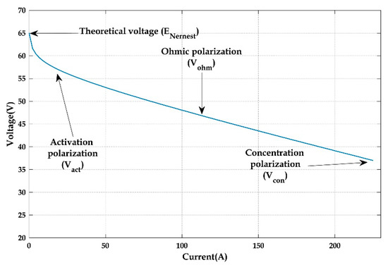 The membrane ohmic resistance is represented as , and this parameters has a correlation with the specific resistivity of the membrane ), membrane thickness as well as the surface area as depicted in Equation (8), but Equation (9) is used in the determination of the specific resistivity of the membrane . The membrane water content is denoted as , while Equation (10) is adopted in the determination of the mass concentration losses. The maximum current density is , while is current density. is the current deduced from the fuel cell. The adjustable parameter is from Equation (10). Figure 3 highlights the nonlinear behaviour of fuel cells. It highlights the various losses in the cell, i.e., activation, ohmic and mass concentration losses.