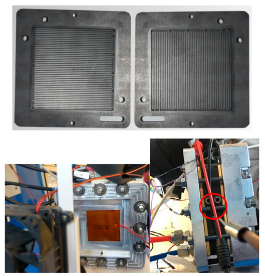 The data obtained for the present study come from a 50 cm2 PEMFC obtained from ElectroChem Inc in the study by [32]. The flow plate of the cell was made up of graphite and had a serpentine flow channel geometry. The anodic electrode was made up of the horizontal flow plate geometry design, while the cathodic electrode was made up of the vertical flow plate geometry design, as depicted in Figure 4. The experiment was conducted based on the detailed protocol from the Joint Research Centre (JRC) [32]. Nafion 112 was utilised as the electrolyte for the cell, while the catalyst loading was 1.0 mg Pt/cm2. There was the absence of microporous layers within the cell, but the gas diffusion layer was Toray TGP–H–060. To curb the leakage of reactant, silicon gaskets were used. The cell test bench is captured in Figure 5. The key operating conditions deduced from the experimental procedure were the relative humidity and stoichiometric ratio. Further information about the test rig is obtainable from [32].