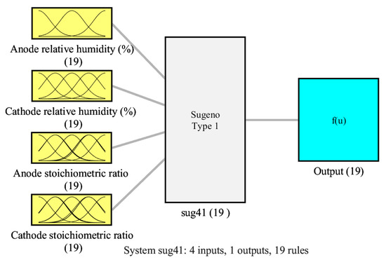 The role of the fuzzification layer is to map the inputs to their corresponding membership values using membership functions (MFs). In the inference engine phase, the fuzzy rules defined in the knowledge base are evaluated using the rule’s antecedents, and their outputs are combined to obtain a fuzzy output in the product layer. The normalised layer then aggregates the fired rules to obtain the final fuzzy output, which can be further processed to obtain a crisp output if necessary. The if-then rules are used in the fuzzy modelling for simulating the input–output mapping, such as: