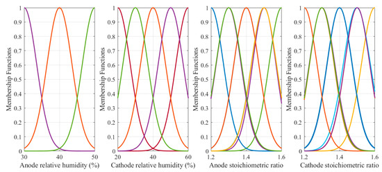 Figure 9 shows the spatial description in a 3D point of view with contours of the system’s input–output function for every two inputs. The peak value of the output is represented by dark red, and the smallest value is represented by dark blue.
