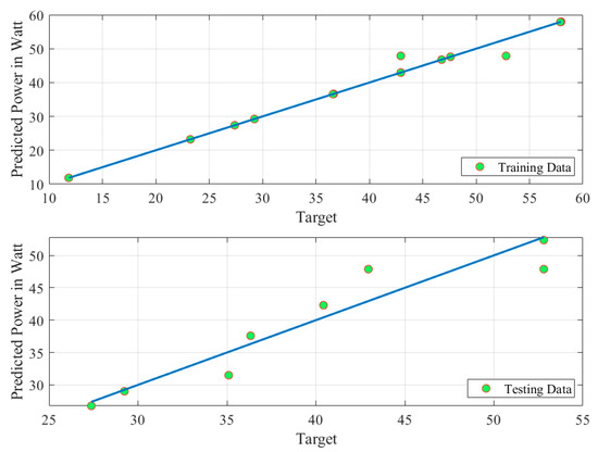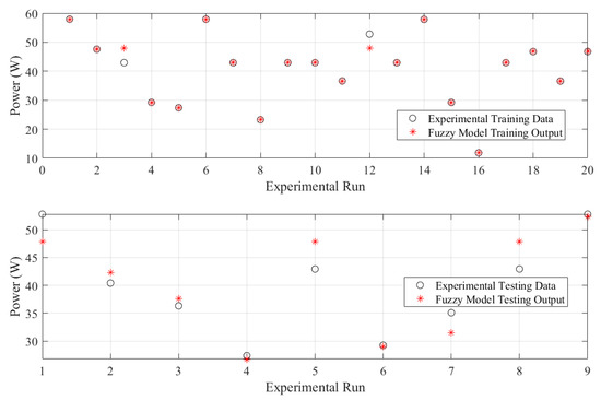 Fuzzy model predictions for PEMFC output power are more reliable when the right relationship between input and output parameters is used during model construction. This can be seen in Figure 10, in which the predicted outputs of the fuzzy model are compared to the those of the experimental data. As can be seen, there is a good agreement between the estimated and measured values. Figure 11 also displays the results of the training and testing phases, showing the plots of the predictions that are centred around the line, indicating 100% precision.