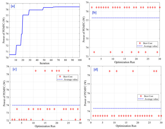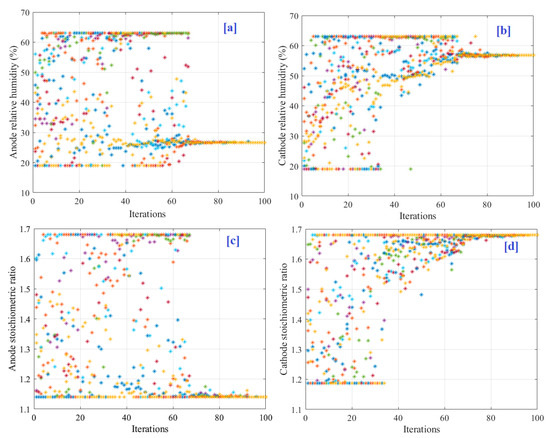 Table 2 presents the best parameters using the experimental data and the AEO. The suggested method boosted the power of the PEMFC from 57.95 W to 78.44 W (by around 35%). The particle convergence during parameter identification is presented in Figure 12. The optimal controlling input parameters values are 26.65%, 56.77%, 1.14 and 1.68, respectively, for ARH, CRH, ASR and CSR.