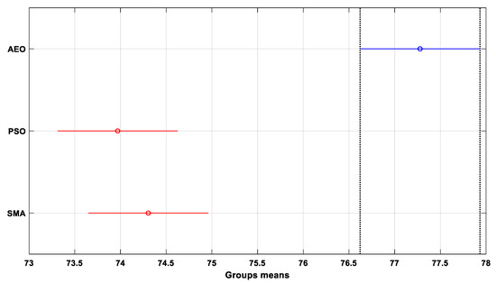 To confirm the superiority of the AEO, ANOVA and Tukey statistical tests are carried out. The use of ANOVA and Tukey tests can help determine if there are statistically significant differences between multiple groups. ANOVA does this by analysing the variation within each group and comparing it to the variation between the groups. ANOVA can be used to determine if the means of the groups are statistically significant and if there are any interactions between the groups. The results provided in Table 5 confirm the difference in the results between the algorithms. The ANOVA ranking presented in Figure 14 confirms that the AEO’s performance is the best, as it provided the higher mean fitness and lowest variations.