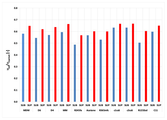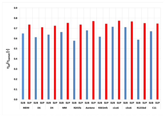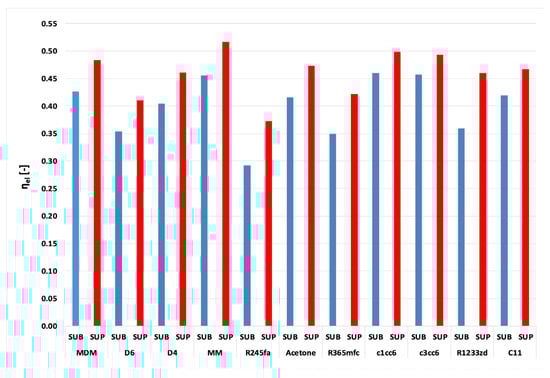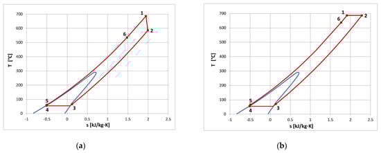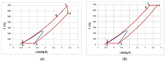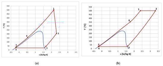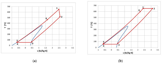 - It is possible to design organic power plants with relatively high efficiency even exceeding 50% (for MM as a working media at the temperature of 686 °C and pressure p0 = 13 MPa). In the case of steam power plants, such high efficiencies can be achieved for ultra-supercritical steam parameters (pressures of the order of 30 MPa, temperatures of 600 °C, even above 700 °C, with double interstage superheating and an extensive system of regenerative heaters).