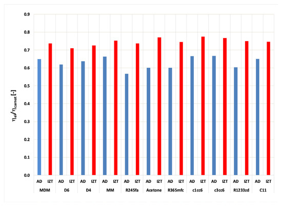 - The efficiency of the cycle with isothermal expansion is visibly higher than the efficiency of the cycle with the adiabatic turbine. The increase in efficiency varies from 8 points for R245fa up to 10 points for acetone.