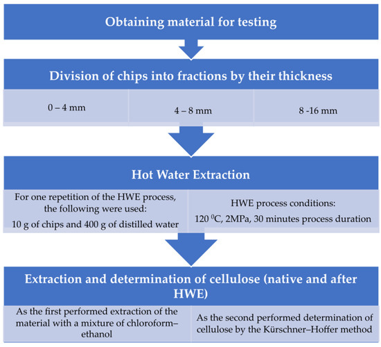 These studies aim to determine whether hot water extraction strongly alters the cellulose content of the material treated with the HWE process, which may translate into a change in efficiency during the production of second-generation biofuel produced from this material. For the study, chips sorted into three fractions due to their thickness were used in order to compare where the greatest changes in the content of the target occur. In addition, the amount of substances leached from the chips from the distilled water used during the HWE process was also examined.