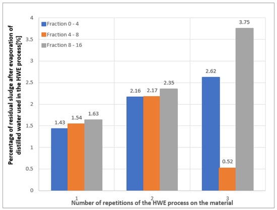 A relationship can be seen here, according to which, with each repetition of the HWE process the amount of sludge increases; the only exception here is in fractions 4–8 after three repetitions of the HWE process. The increasing values of the leached substances during the HWE process as a result of the increasing number of repetitions of the HWE process on the material are shown in Figure 3.