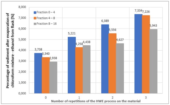 Looking at the graph presented in Figure 4, we can observe the relationship, according to which, with the increasing number of repetitions of the HWE process on the material, the amount of substances washed out by the chloroform–ethanol mixture increases. It is also easy to see that most substances were leached from fraction 0–4, but the least were from fraction 8–16.
