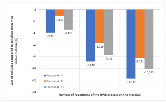Analyzing the percentage of cellulose content shown in Table 4, we can see that the HWE process resulted in a decrease in cellulose content with each repetition of the HWE process. The total range within which there was a decrease in cellulose content after each repetition of the HWE process is from about 2 to 5%, with the range varying slightly in each fraction. The largest decrease in cellulose occurred in chips of fractions 0–4, while the smallest was in fractions 4–8. In fractions 8–16, there was a decrease that was smaller than in fractions 0–4 but greater than in fractions 4–8. The largest decrease in cellulose content occurred under the second repetition, while the smallest was after the third repetition; this relationship is the same for chip fractions 8–16 and 0–4.