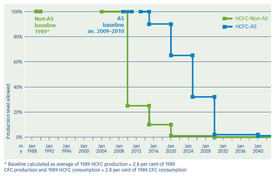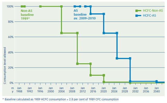 The low ozone depletion potential refrigerants, HCFCs, such as R22, have excellent refrigerant properties compared to R11 and R12, which help the transition away from CFCs. However, these components still contain ozone-destroying chlorine. Referring to the terms of the Montreal Protocol [28], the phase-out schedule of this type of refrigerant is shown in Figure 1 and Figure 2.
