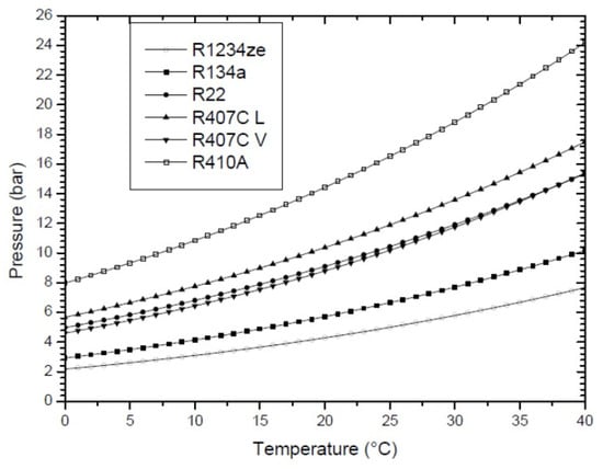A core consideration in refrigerant choice is its environmental impact. This impact includes the refrigerant’s ODP (ozone depletion potential) and its GWP (global warming potential). The ODP indicates the intensity of ozone layer destruction by various refrigerants based on the ODP of R11 as a standard. The GWP represents the degree of contribution to global warming of different greenhouse gases based on CO2 as a reference. Table 1 summarizes the environmental impact of the used refrigerants. R1234ze presents the lowest value of GWP. Additionally, R134a, R407C, and R410A are non-ozone-depleting mixtures of HFC refrigerants. R410A is an azeotrope blend comprising two equal portions of refrigerants, R32 and R125. R407C is a zeotropic ternary mixture. It comprises R32, R125, and R134a refrigerants with ratios of 23%, 25%, and 52%, respectively. Figure 3 presents the saturation pressure of the different refrigerants vs. the temperature. The operating pressures of R1234ze are the lowest, and those of the R410A are the highest. Compared to R22, the operating pressures of R410A refrigerant are higher by more than 50%. Therefore, high-pressure compressors, thicker-walled tubing, and components must withstand these high pressures.