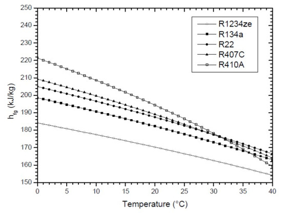 The variation of the enthalpy of vaporization, hfg, is presented in Figure 4. R410A presents the highest hfg for low temperatures. As a result, R410A permits using less coil, a smaller displacement compressor, and fewer refrigerants, keeping the system efficiencies comparable to the current R22 unit. The variation of the hfg of the R407C is similar to R22.