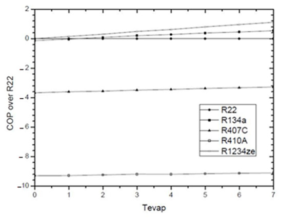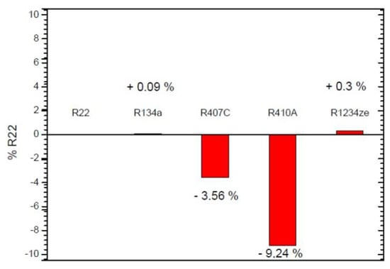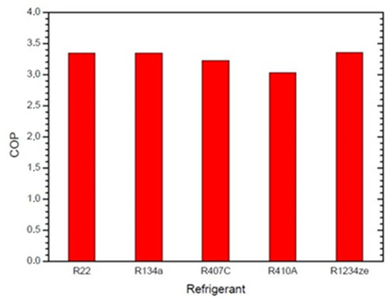 Figure 6 compares the COP of the unit using the studied refrigerants. The COPs of the system with refrigerants R22, R134a, R407C, R410A, and R1234ze are 3.344, 3.347, 3.225, 3.035, and 3.354, respectively. The cycle operating with the R1234ze had the highest COP, followed by the R134a, R22, R407C, and R410A. The comparison between the energy efficiency of all refrigerants with the R22 is shown in Figure 7.