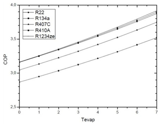 Compared to the R22 cycle, the COP of the R1234ze and the R134a cycles exceeded by 0.3% and 0.09%, respectively. The influence of the evaporating temperature and ambient temperature on the COP reached for different fluids are presented in Figure 8 and Figure 9, respectively.