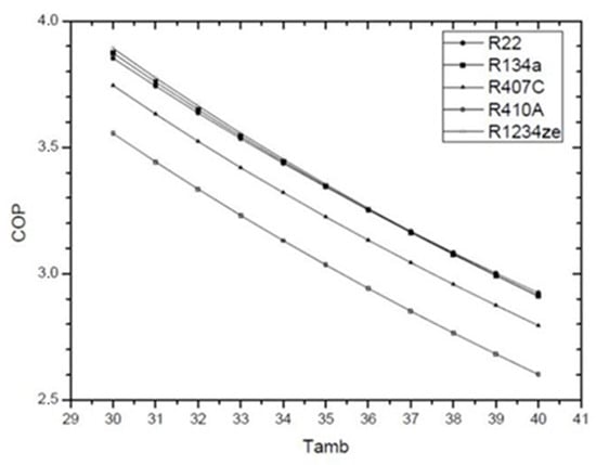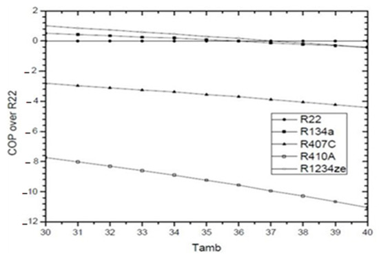 The augmentation of the ambient temperature causes COP variation compared to R22 from 0.52 to −0.41% and from 1.1% to −0.44% for R134a and R1234ze, respectively. This energy analysis proved that R1234ze shows the best energy performance among the considered working fluids compared to R22.