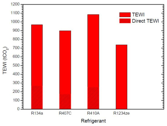 The compared refrigerants are the null ODP: R134a, R407C, R410A, and R1234ze. The environmental impact comparison of using different refrigerants is based on the total equivalent warming impact (TEWI) presented in Figure 12.