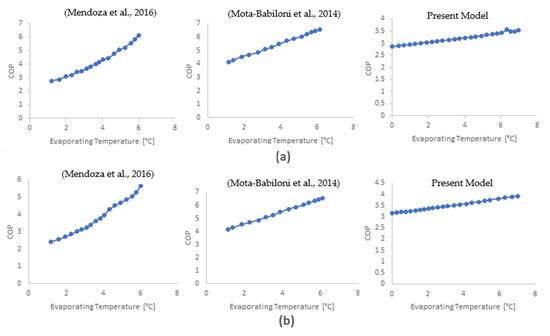 We used comparable studies in the literature to validate this model since no results are available for the specific conditions and configurations. Therefore, comparisons were made by referring to the trends of specific parameters. The works of Mota–Babiloni et al. [10] and Mendoza et al. [11] compare adequately with the present study. Figure 13 compares the evolution of COP with the evaporator temperature from the previous works.