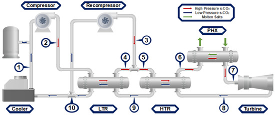 The installed capacity of concentrated solar power (CSP) technology has increased to more than , with Spain and the USA being the first adopters. However, an important number of projects are under development in the MENA region, South Africa, China, and Chile, among other countries [1]. Despite the increasing installed capacity of CSP technologies, the scientific community has been actively seeking technological improvements. One of the current research lines aims to implement new heat transfer fluids to operate TES systems at higher temperatures, increasing the power block’s conversion efficiency. The peak-load thermal-to-electric efficiency in the cycles commonly used in CSP systems is between 30% and 40% at turbine inlet temperatures lower than 600 °C. In contrast, conventional power plants can achieve efficiencies close to 58% using combined-cycle gas turbines [3]. Currently under development, the third generation of CSP considers a closed cycle using supercritical carbon dioxide (s-CO2) as the working fluid, with the recompression Brayton cycle (RcBC) as the most prominent configuration [4].