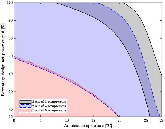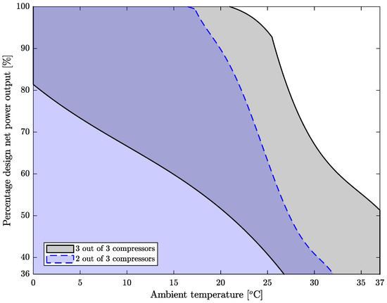 Coupled operational range for the proposed cycle with 2 and 3 out of 3 compressors functioning.