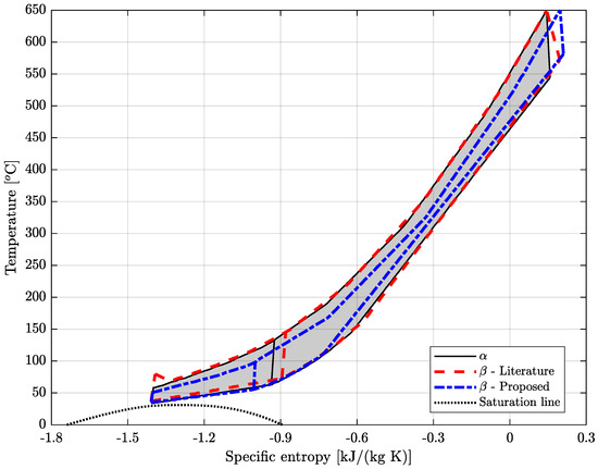 Figure 5 presents the T–s diagrams of the cycle under nominal operational, i.e., at point — where the literature and the proposed cycles are identical —with the continuous black line (and shaded area), and the literature and proposed cycles at point with the dashed red and dash-dotted blue lines, respectively. At point , the cycle’s lowest temperature is close to the critical point, but, since the LTR outlet (i.e., where the flow splits) is further to the right side, the influence of the critical region is not significant. Due to the discretization considered by the model in the recuperators, the HTR part of the diagram does not have as many nodes as the LTR, which explains the sharp straight segments observed in that section of the diagram. Likewise, after the flow splits, the state corresponding to the cooler outlet causes a straight line at the bottom-left of the graph.