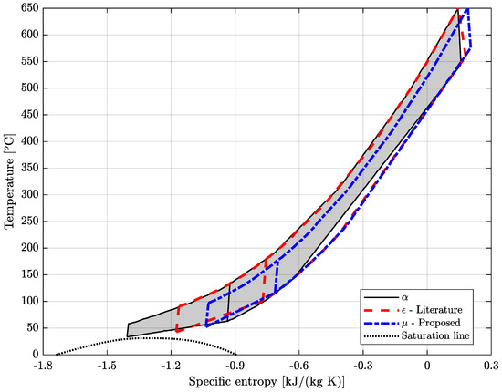 T–s diagrams for: both cycles at point , the literature cycle at point , and the proposed cycle at point .