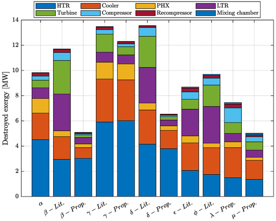 Quantifying the irreversibilities associated with the cycle off-design operation provides insight into the mechanisms responsible for decreasing its conversion efficiency. In this sense, Figure 8 shows the destruction of physical exergy by cycle configuration and its components at different key points. Analyzing Figure 8, it is possible to verify that the proposed cycle always destroys less exergy than the literature cycle. Moreover, the total exergy destroyed varies little with the net power output for the literature cycle, which, in all the scenarios analyzed, is higher than 8500 ; however, for the proposed cycle, it reaches as low as 5000 at . The exergy destroyed increases when decreasing the net power output for the literature cycle (points , , and ); the opposite effect is observed for the proposed cycle (points , , and ).