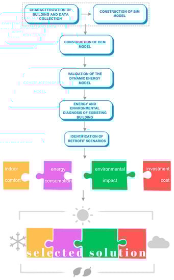 The proposed retrofit interventions aim to achieve building indoor comfort, reduce energy consumption, reduce environmental impact, and minimize the payback period. The methodological approach is based on a multi-parameter analysis combining different physical domains by implementing BIM. The simple model proposed is useful to evaluate the effectiveness of building retrofits.