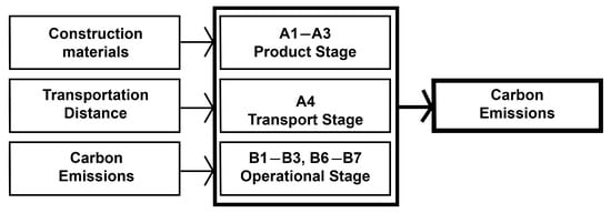 The Life Cycle Inventory (LCI) phase involves collecting data, including primary impact processes such as product manufacturing and secondary impact processes such as energy consumption. Validating the collected data with respect to the selected process units is essential. The results obtained in the Life Cycle Inventory are then analyzed and compared to environmental impact indicators []. In the Life Cycle Impact Assessment (LCIA) phase, emissions are classified into impact categories, which are further grouped for comparison. The EN 15084 [] standard provides a detailed description of the building life cycle, divided into phases and modules. It follows the principle of modularity, attributing processes influencing environmental performance to specific modules and associating resource consumption and emissions with the processes generating them. This European standard, also adopted in Italy, specifies the calculation method based on LCA and other quantitative environmental information to evaluate a building’s environmental performance and communicate assessment outcomes []. By emphasizing embodied carbon, it represents the CO2 equivalent (CO2eq) associated with materials and construction processes throughout a building’s or infrastructure’s entire life cycle []. It encompasses the CO2 emissions produced from construction to end-of-life, including transportation and building techniques. Therefore, embodied carbon reflects a building’s or infrastructure’s carbon footprint before it becomes operational and after decommissioning when materials are recycled. Notably, with improvements in building energy efficiency leading to a reduction in operational carbon, recent data from the World Green Building Council indicate that embodied carbon constitutes a larger proportion of a building’s overall carbon footprint [].