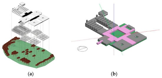 (a) Axonometric exploded view of the BIM; (b) axonometric view of the BEM.
