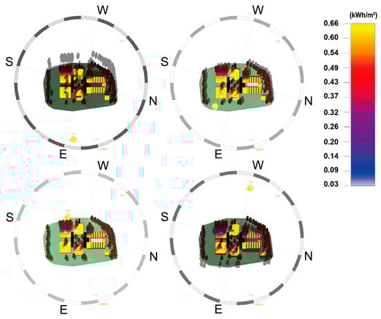 Figure 5. Solar radiation maps at 7:00 a.m., 10:00 a.m., 1:00 p.m., and 4:00 p.m. on 1 June. - Scenario 5 (S5)—Solar Thermal System (Renewable Energy Strategy): According to the case study building end-use, the natural gas consumption for water heating that is used for the treatments is the highest energy use. Indeed, a water temperature of at least 70 °C must be constantly guaranteed, considering the arrival temperature of 23 °C from the natural hot springs. To achieve this aim, this scenario proposes the implementation of a hybrid system with solar collectors supported by a natural gas boiler that always guarantees the required temperature but uses mostly renewable energy. Moreover, the actual operation of the structure mainly during the summer months allows for optimizing the performance of this system because the solar system can cover the total energy needed for water heating due to higher solar radiation availability during the summer. The solar thermal system is positioned above the building that houses the technical room to favor proximity to the systems and sun availability. Six systems were designed for a total of 1800 l. Each system has a capacity of 300 l;