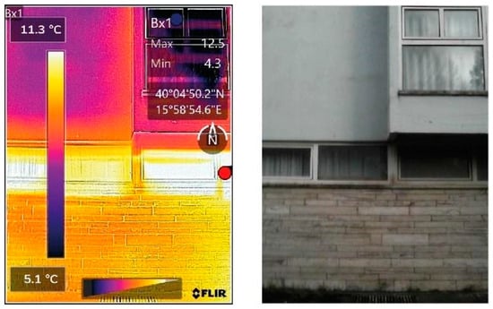 Infrared thermography is a well-known non-destructive technique for thermal bridge diagnostics and surface defect detection. Therefore, it is a tool to support building energy efficiency improvements []. Infrared thermography inspections of building envelopes are used to detect heat losses, missing or damaged thermal insulation in walls and roofs, thermal bridges, air leakage, and moisture sources [].